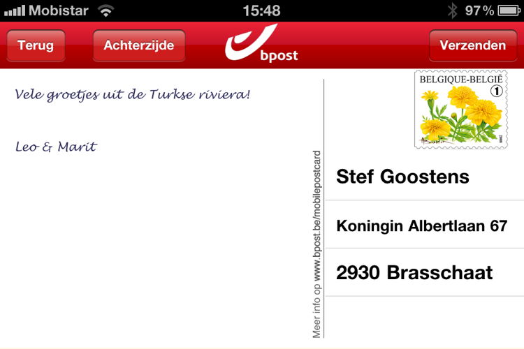 Als kick-off van de applicatie kunnen de eerste 5000 Mobile Postcards downloads hun eerste kaartje gratis versturen. Daarna betaal je 2,35 euro per kaartje. Het downloaden van de applicatie is volledig gratis. Als je ‘m voor 15u verstuurt, valt hij trouwens de volgende dag al in de brievenbus.